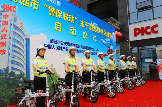 人保财险清远市分公司负责人刘大姿、市交警支队副支队长刘志锋及清城区交警副大队文杰在启动仪式上分别进行致辞,并出席推杆仪式。启动仪式上,清远市分公司首批10名保险引导员整装待发,每人配有一辆电动自行车,穿戴印有“保险引导员”字样的马甲和头盔,并携带医药箱和协赔工具上路巡查。