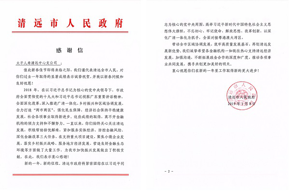 2月18日,太平人寿清远中支收到清远市人民政府发来的感谢信,清远市人民政府对太平人寿清远中支过去一年取得的显著成绩表示诚挚祝贺和感谢。