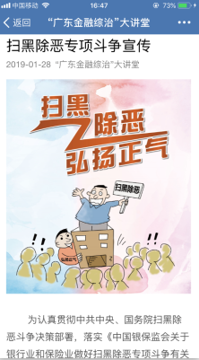 省公司微信公众号分别于1月28日及2月14日发布了两则扫黑除恶宣导信息,鼓励员工及营销员在朋友圈中积极转发,大力宣传。