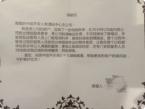客户黄先生2017年通过中国平安电网销渠道投保了一份守护随行意外险,外出山区工作时发生不慎被落石撞伤,造成腿部损伤。接受初步治疗后出院在家休养,2月初通过金管家完成自助理赔并很快收到理赔金。但后续多次复诊的医疗费用尚未申请,故再次报案,清远中支受理案件后,了解到客户行动不便,第一时间预约客户,由电销与理赔服务人员安排上门探视慰问、了解客户伤情、收取理赔申请资料,并快速完成审核流程,客户也如愿收到后续的理赔金。由于客户仍需接受较为长期的治疗,清远中支特意安排了专门的服务人员持续跟进黄先生的服务,协助他办理一切业务,客户感叹我们服务的到位,还特意向我司送上感谢信。
