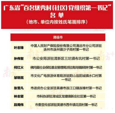 为表彰先进,激励广大党员干部新时代新担当新作为,加强基层党组织带头人队伍建设,中共广东省委组织部授予100名同志全省“百名优秀村(社区)党组织书记”和 100名同志全省“百名优秀村(社区)党组织第一书记”称号。人保财险清远市分公司派驻连州市连州镇沙子岗村第一书记叶志锋同志光荣上榜。