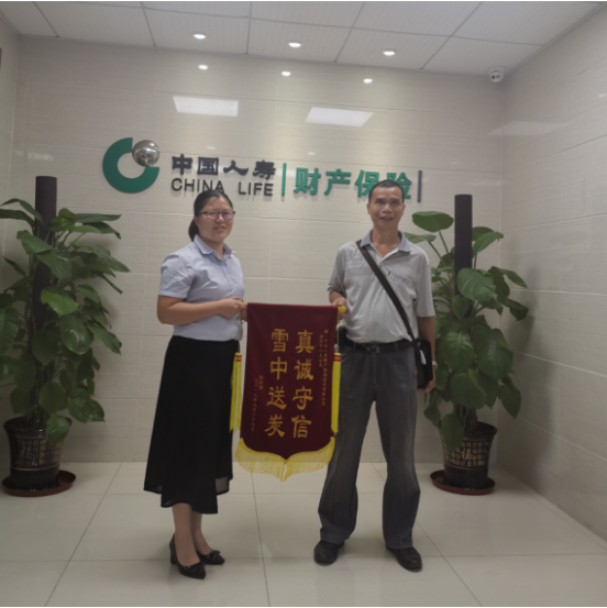 “感谢中国人寿财险清远中支,感谢工作人员,在这次事故中工作人员专业而且服务态度好,及时赔付了我们赔款,在我们不幸遭遇中雪中送碳。”2019年10月24日,三者方伤者陈*娣家属专程来到国寿财清远中支理赔部,送上锦旗表示感谢,称赞国寿财险清远中支“真诚守信,雪中送碳”。