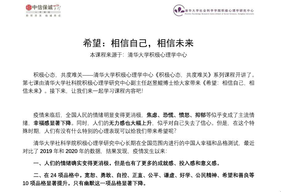 为帮助员工进行防疫期心理建设,中心保诚人寿人力资源部将清华大学社科学院积极心理学中心制作的一系列积极心理学课程引入供大家学习。该课程从情绪、理性、乐观、助人、优势、心态、希望等七个方面来提升人们的积极心理,点燃大家内心希望的种子,增强免疫力,减少焦虑和恐慌。
