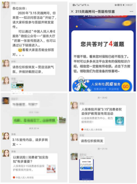 通过发动内勤和外勤人员积极参与和转发总公司统一举办的“3.15”知识有奖问答活动,以及积极转发“以案说险”微文、《关于保险消费维权提示》H5等线上宣传教育活动形式营造活跃的气氛。