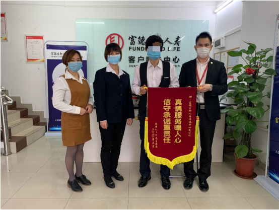 何先生一家收到赔款后甚是感动,梁女士表示十分感谢富德生命清远中支的关怀与协助,非常感恩自己能在大爱的富德生命人寿保险公司工作。3月23日梁女士携同丈夫何先生为富德生命清远中支送来锦旗,并表示经过此次,自己更加坚定了要在富德生命人寿发光发热的信念,保险事业值得一生去经营并为之奋斗。