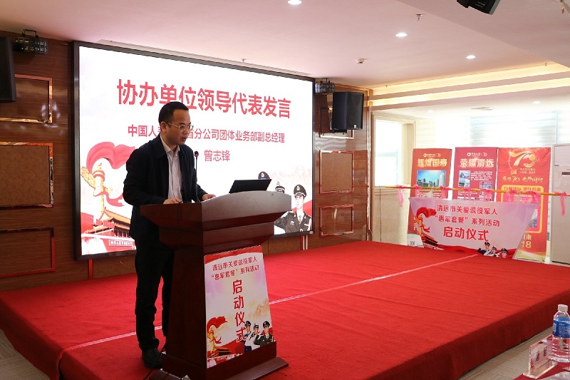 中国人寿广东分公司团体业务部曾志锋副总经理代表中国人寿发言。本次活动是中国人寿为贯彻落实习近平总书记关于做好退役军人工作和双拥工作系列重要论述精神,发挥保险在拥军优抚事业中的特色作用中一项重要工作。中国人寿清远分公司为全市退役军人提供“惠军套餐”的优惠保险保障方案,提高退役军人的荣誉感、获得感、安全感,为他们提供暖心的保障,让军人成为全社会尊崇的职业。