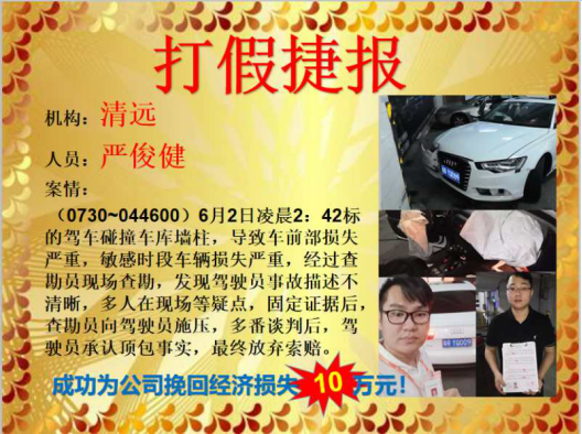 2020年6月2日凌晨2:42,太平财险清远中支承保的标的车(粤RY***9)碰撞车库墙柱,导致前车部损失严重,由于本次案件是深夜时段发生,且车辆损失严重,经过太平财险清远中支查勘员严俊健现场查勘,发现驾驶员事故描述不清晰,现场聚集多名人员等疑点,查勘员经多番与肇事司机谈判后确认,本次事故是驾驶员故意顶包,最终放弃索赔,成功为太平财险清远中支挽回经济损失10万元!