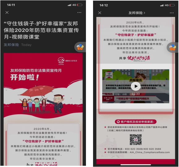友邦保险中国区总部及广东分公司通过企业微信公众号等工具向从业人员及客户宣传防范非法集资知识。6月15日,友邦保险中国区总部在“友邦保险”微信公众号上发布《“守住钱袋子·护好幸福家”友邦保险2020年防范非法集资宣传月-视频微课堂》,通过小视频介绍防范非法集资小知识,展示保险业高发易发的非法集资案件类型,提高公众防范非法集资风险意识。6月11日至15日,友邦保险广东分公司在“友邦 ‘广东金融综治'大讲堂”微信公众号上发布5期的《2020非法集资系列宣传》推文,通过连续5日的推文学习,友邦保险清远中支发动全体员工及营销员学习、转发,营造浓厚的防范非法集资学习氛围。