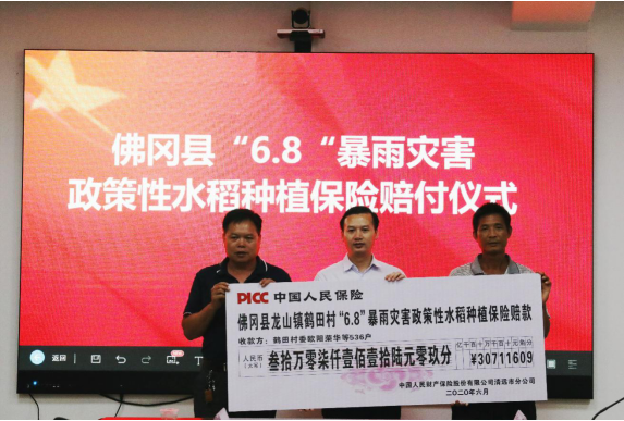 6月22日下午,人保财险清远市分公司在佛冈县龙山镇政府举办佛冈县“6.8”暴雨灾害政策性水稻种植保险赔付仪式,佛冈县委农办常务副主任朱志强、龙山镇委副书记罗文亮、人保财险清远分公司总经理助理林传斌、人保财险佛冈支公司经理郑志锋,佛冈县及龙山镇农办相关人员、龙山镇鹤田村委及受灾农户代表等参加本次仪式。