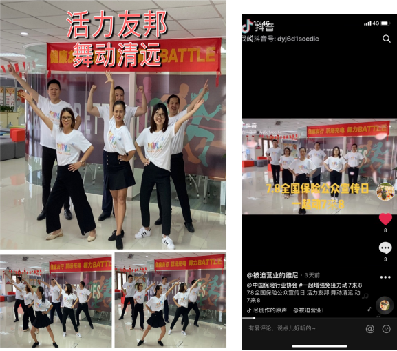 友邦保险清远中支积极发动内外勤用手机拍摄“一起增强免疫力动7来8”相关主题短视频,在各社交网络平台发布,呼吁点赞,向公众传递积极向上的健康生活方式,普及健康与保险理念。为扩大活动影响力及覆盖面,友邦保险清远中支总经理白铨桥亲自带领全体内勤同事在职场齐跳活力舞蹈并拍摄抖音短视频,在公司内部营造浓厚的活动氛围。(友邦保险 曾颖娴)
