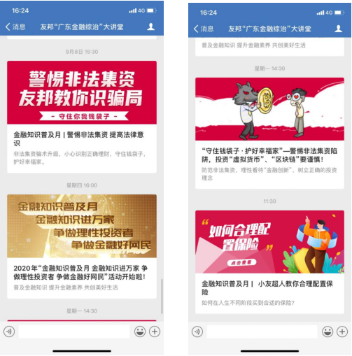 为拓宽宣传渠道,友邦保险清远中支通过官方微信、内部企业号等数字平台宣传活动主题,9月8日起,友邦广东企业号陆续通过“广东金融综治”大讲堂推送《警惕非法集资 提高法律意识》《守住钱袋子 护好幸福家》《小友超人教你合理配置保险》等推文,向金融消费者普及基础金融知识,提高金融消费者的风险识别和自我保护能力,共同创建平安、和谐的金融环境。(友邦保险 曾颖娴)