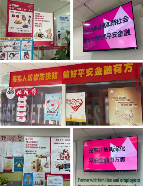 为进一步提升友邦人寿清远中支平安金融建设水平,切实将“平安金融宣传月”的指导思想和宣传重点落到实处,友邦人寿清远中支充分利用职场的LED屏进行活动主题的宣传,滚动播放“六稳六保发展和谐社会,同心同德共建平安金融”等活动主题口号。在职场悬挂主题横幅进行宣传。同时,在客服柜台摆放、张贴各类宣传材料,供营销员及客户阅读和学习。