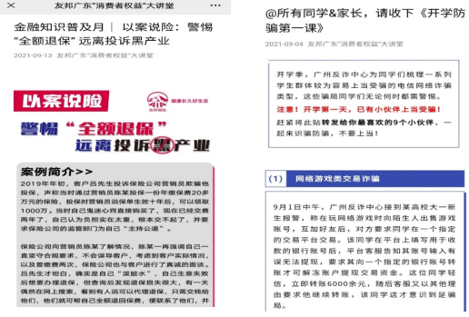 为拓宽宣传渠道,公司通过官方微信、内部企业号等数字平台宣传活动主题。例如,友邦广东企业号、“友邦广东‘消费者权益’大讲堂”微信公众号在9月陆续推送《友邦广东正式启动“金融知识普及月”活动》《金融知识普及月|您的微信是最温暖的名片,一起来成为金融知识宣传大使!》《金融知识普及月|又想套路我?老年人防骗指南来了!》《金融知识普及月|电信网络诈骗避坑指南》《金融知识普及月|以案说险:警惕“全额退保” 远离投诉黑产业》《金融知识普及月|以案说险:“身故保险金受益人”之谜》等推文,向金融消费者普及基础金融知识,提高金融消费者的风险识别和自我保护能力,共同创建平安、和谐的金融环境。我公司鼓励内勤员工、营销员积极转发宣传,通过线上、线下相结合开展宣传,营造浓厚的宣传氛围。