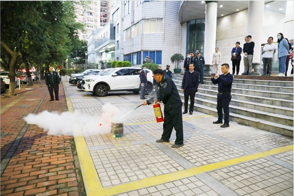 培训会结束后,全体参训人员在保险大厦正门进行消防安全演练,授课老师讲解了灭火器具的使用方法以及日常维护检查和注意事项,并进行操作示范。随后,在开阔地带准备好模拟起火部位,物业安保人员与部分员工代表利用灭火器进行现场灭火演练,其他人员认真观摩整个过程。