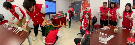 活动中,主持人组织了 “圣诞树大作战”、“麋鹿和甜甜圈的爱情故事”和“水果保龄球”等几个有趣的小游戏,每两人一组,相互配合相互对垒,大家各显神通,各个环节都风格迥异,逗得大伙开怀大笑,节日气氛浓烈,游戏结束后,中意人寿清远中心支公司总经理胡房桂先生以及副总经理阮家伟先生为每位员工派发了代表节日祝福的圣诞礼物,祝愿大家平平安安,喜乐安康。此次圣诞主题团康活动,得到了全体同事的一致好评,同时加深了员工之间的凝聚力和归属感。