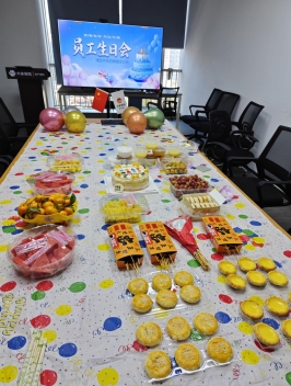 员工们欢聚在一起,为过生日的同事送上诚挚的祝福,大家一起分享了蛋糕和美食,现场气氛格外温馨,欢声不断。