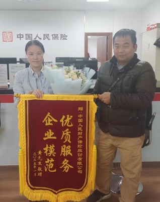 2月,人保财险清远分公司理赔中心理赔员周蝶映收到了一份特殊惊喜。客户黄先生满怀感激之情,为其送来了鲜花与锦旗,以表达对人保财险理赔服务的高度认可和衷心感谢。