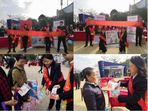 在清远江边的演义广场,根据人行的活动安排,各单位领导及代表纷纷排队在活动背景墙上签名留念,清远分公司展台在广场正中前排,参与代表摆好宣传海报展架,每人穿着公司司服,肩披红绸带,积极向过往群众派发宣传小册子与小礼品,热心向民众宣传、解释活动主题的反洗钱与扫黑除恶知识,提醒市民增强防范意识,让市民明白:全民参与反洗钱与扫黑除恶活动中方能有国泰民安的平安日子。并且在背景墙签名及合照活动中得到人民银行反洗钱科骆科长的积极支持参与及见证。