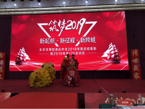 首先,由太平洋寿险清远中支徐丽娜总经理为醒狮点睛,赋予其生命、灵性,为清远中支2019年开门红带来吉祥如意的好兆头,清远中支2019年不负使命,共创辉煌。紧接着,清远保险行业协会秘书长陈朝荫秘书长致辞,通过清远保险市场大数据分析,呼吁大家共同规范化保险行业建设,高质量发展保险行业。