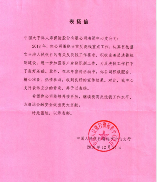 2018年度,太保寿险清远中支围绕当前反洗钱重点,认真贯彻落实当地人民银行的有关反洗钱工作要求,积极完善反洗钱机制建设,进一步加强客户身份识别工作,为反洗钱工作打下了良好基础。此外,在2018年11月反洗钱宣传月中,我司积极参与、主动配合、精心准备,活动收到了良好的宣传效果。对此,中国人民银行清远支行表示充分的肯定,并予以表扬。
