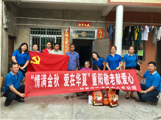 秋风送爽,丹桂飘香,华夏保险2019年秋季公益行动已拉开序幕。为积极响应“热心公益,关爱老人,投身社会公益”的号召, 10月13-15日,华夏保险清远中支组织爱心小队前往英德沙口镇,开展“情满金秋,爱在华夏”重阳慰问行动。