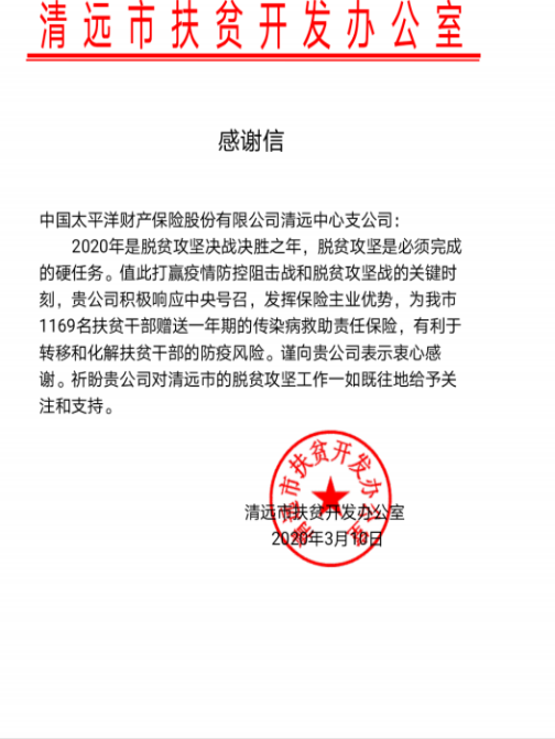 3月10日,清远市扶贫开发办公室向太平洋财产保险清远中心支公司发来感谢信,对太平洋产险向清远市1169名驻村扶贫干部赠送传染病救助责任保险的善举表示感谢。