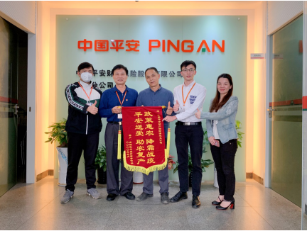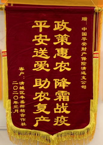 3月25日,岭南特色水果种植保险客户特意送来锦旗,感谢平安产险清远中支理赔查勘人员在疫情期间降霜战疫、助农复产,提供迅速、有温度的理赔服务!