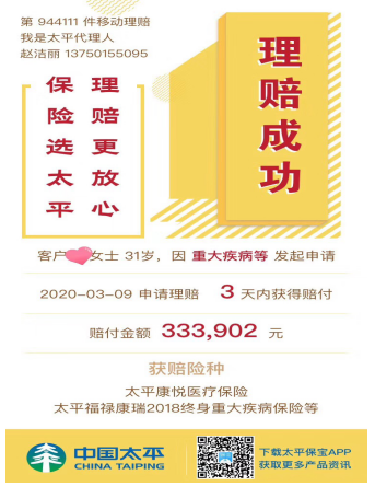 “不到三天时间就赔付了,这是我没有想到的,太平的理赔速度很快,服务也很好,我很满意”,H女士生收到太平人寿清远中支理赔结案短信,惊喜的说道。
