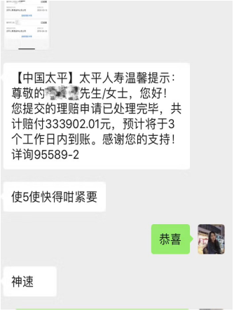 客户出院后,太平人寿清远中支代理人立即协助客户收集资料,提前将理赔资料发给太平人寿清远中支理赔人员预审,保证资料的齐全后,通过秒赔操作提交理赔申请,太平人寿清远中支理赔人员即刻跟进案件进度,追踪每个环节的时效,确保案件用最短的时间顺利结案,最终3天赔付约33万元理赔金。