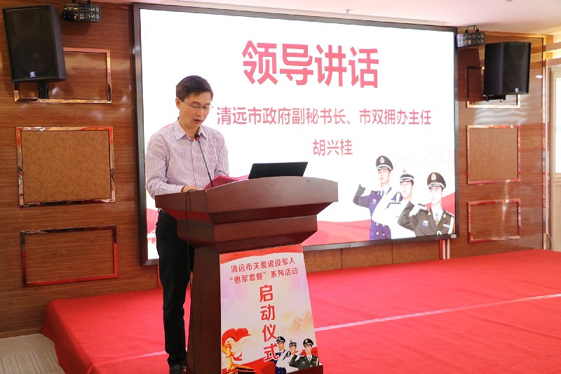 会上,清远市政府胡兴桂副秘书长作重要讲话。胡副秘书长对本次活动给予高度的评价,同时提出三点工作希望:一是各协办单位与退役军人事务部门边实施边推进,把好事办好,把实事办实,提升退役军人的获得感,幸福感。二是各级单位需积极对接、支持配合、创新作为,为“惠军套餐”推行提供必要条件,确保尽快落地,马上见效。三是各单位积极对接套餐,为退役军人提供多方面服务,为清远拥军优属活动打造新亮点、新品牌。向参加抗疫一线退役军人赠送保险仪式。