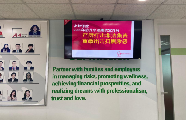 友邦保险清远中支营业网点将宣传月主题宣传印刷品张贴、摆放于公司前台、客户服务大厅等职场显眼位置,群众可以随时取阅防范非法集资宣传折页。利用职场电视屏幕连续滚动播放或张贴“远离非法集资,拒绝高利诱惑”“打击非法集资,严惩黑恶犯罪”“严厉打击非法集资,重拳出击扫黑除恶”等联合宣传标语。在向客户提供服务时,友邦保险清远中支要求柜面服务人员、保险营销员主动向客户派发宣传资料,积极配合宣传月系列活动。在此基础上,还在职场开设“防范非法集资”合规宣传教育专栏,宣传内容为中国银保监会办公厅关于2020年防范非法集资宣传月活动的相关通知文件或防范非法集资的相关普及知识。