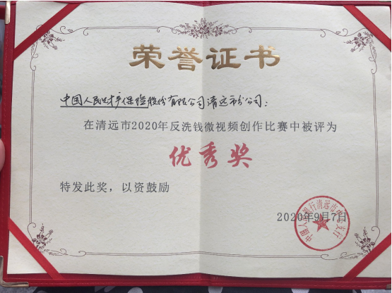 | 人保财险清远市分公司积极开展反洗钱宣传活动并获得2020年清远市反洗钱宣传微视频优秀奖 |