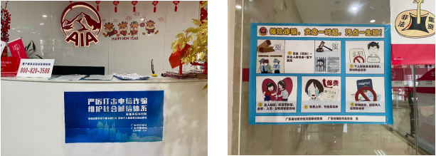 友邦清远在职场显眼位置、客户人流集中区域张贴活动主题海报,摆放宣传资料,通过多种途径加强开展打击治理电信网络新型违法犯罪诈骗宣传工作,帮助社会公众、公司客户、员工及营销员更好地认识“电信网络诈骗犯罪”的危害,切实增强人民群众防诈反诈意识,提升其金融素养和风险责任意识,免受违法违规金融活动侵害。