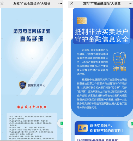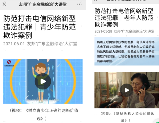 活动期间,友邦通过官方微信、内部企业号等数字平台宣传活动主题,推动打击治理电信网络新型违法犯罪。 通过“防范电信网络诈骗宣传手册”、“抵制非法买卖账户守护金融信息安全”等金融知识普及,以及“青少年防范欺诈案件”、“老年人防范欺诈案件”等推文,详细介绍宣导电信网络诈骗的背景、种类、常用作案手法和作案方式,以及诈骗案例分享和识别、防范的方法。