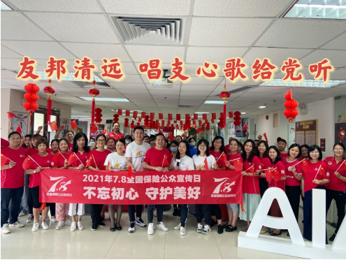 为庆祝中国共产党成立100周年,积极传播保险行业正能量,友邦清远积极响应号召,以形式多样的方式开展主题为“不忘初心 守护美好”的 2021年“7.8全国保险公众宣传日”活动,助力保险业宣传,共同践行爱与责任,守护健康长久好生活。