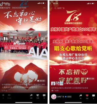 友邦清远号召全体内外勤伙伴发挥创意、积极参与拍摄短视频大赛活动,通过创意好、接地气、动人心的短视频作品展示友邦人爱党爱国、高歌新时代的精神风貌。友邦清远内外勤伙伴纷纷通过抖音、视频号、微信朋友圈等点赞、转发短视频,营造浓厚的活动氛围。