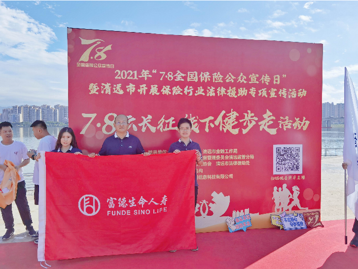 为向社会普及保险金融知识,提高公众保障意识,推动行业形象持续改善,积极传播保险行业正能量。富德生命人寿清远中支参加了清远市保险行业协会在江滨公园演艺广场举办的7·8云长征线下健步走活动,中支副总经理(主持工作)张军带队参加了健步走活动,同时我司组织了内外勤人员分别参加清远市保险行业协会在顺盈时代举办的现场宣传活动,及自行前往体育公园开展主题为“不忘初心,守护美好”的户外宣传活动;同时在中支职场张贴宣传海报及在广告机循环播放7·8系列宣传视频。