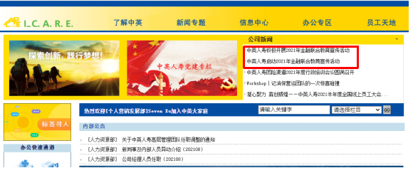 公司内网顶部设置活动专栏,面向中英人寿全体员工进行宣传教育。