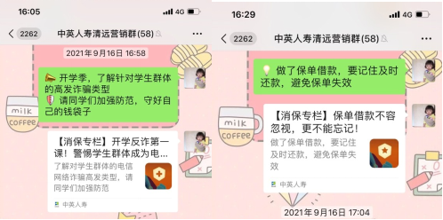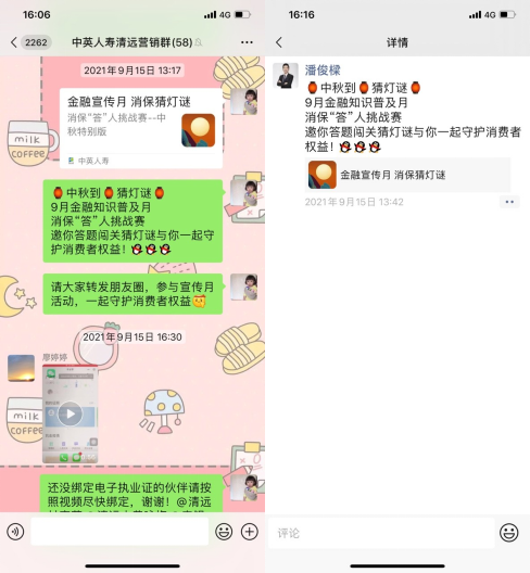 9月16日,我司内勤在微信工作群转发中英人寿公众号发布的消保专栏推文“金融知识普及月 金融知识进万家 争做理性投资者 争做金融好网民”和“教你识别非法金融广告”进行活动宣传,宣传内容包含本次活动时间、活动名称、活动主题及活动口号。