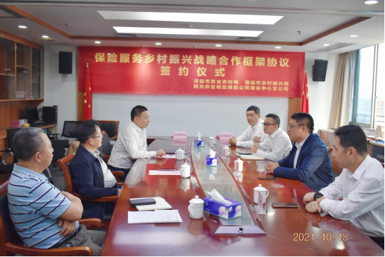 10月18日,阳光农业相互保险公司清远中心支公司与清远市农业农村局、清远市乡村振兴局签订《保险服务乡村振兴战略合作框架协议》。清远市农业农村局、乡村振兴局局长张伟杰,副局长谢振权,计财科长唐成超,阳光农业相互保险公司广东分公司副总经理王鑫,清远中支总经理陈进宏及清远中支班子成员等相关领导出席了签约仪式。