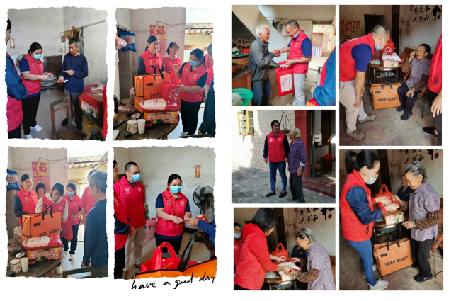友邦清远志愿者服务队一行12人,带着自发捐款购买的毛毯、棉被、大米、面条、毛巾袜子等生活必备品,在村委会的带领下,探访村里的10户独居或孤寡老人。