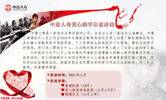 中意人寿是一家有社会责任感的公司,自成立以来一直关注公益事业。中意人寿清远中心支公司自2018年与清新区教育局相关负责人沟通了解到清新区有许多乡镇小学教学条件简陋艰苦,不少贫困学生家庭经济十分困难,看到这些孩子的艰难,我们决心要做点什么,从此越来越多的中意人踏上了这条公益助学之路。