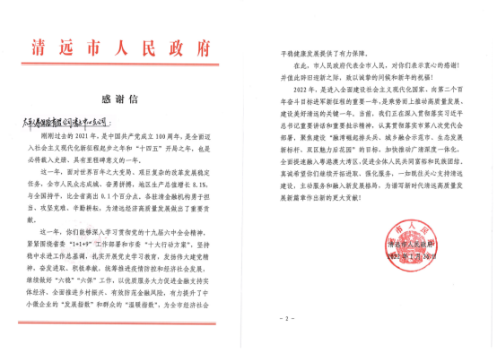 感谢信指出,2021年太平人寿清远中支深入学习党的十九届六中全会精神,紧紧围绕省委“1+1+9”工作部署和市委“十大行动方案”,坚持稳中求进工作总基调,扎实开展党史学习教育,发扬伟大建党精神,继续做好“六稳”“六保”工作,以优质服务大力促进金融支持实体经济、有效防范金融风险,为全市经济社会平稳健康发展提供了有力保障。