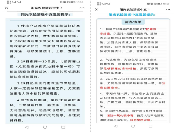 面对极端天气,阳光农险迅速启动应急预案,提前做好灾害防范预警,在公众号刊登提醒防范寒潮信息,阳山支公司提前部署,安排三组人走访未采摘完毕砂糖桔种植农户共36户,提醒广大农户做好防灾减灾准备。