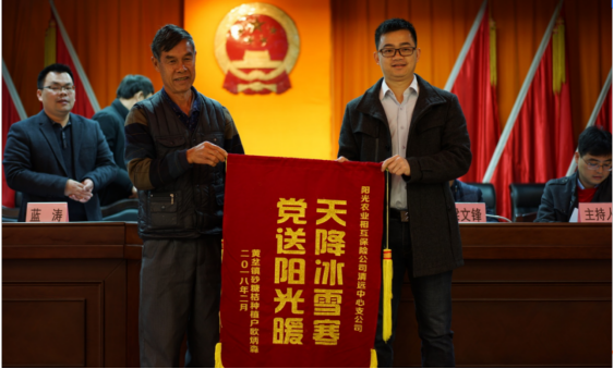 砂糖桔是阳山县的重点农业产业,由于种植地点地处山区且砂糖桔开花结果期长,极易受冻灾影响。2017年阳光农业相互保险公司在清远市首创砂糖桔种植保险,受到当地农户的热烈欢迎,2018年1月由于寒潮影响,阳光农险共支付砂糖桔理赔款400万元,赔付率高达800%。清远市政府相关领导高度评价“阳光农险为清远及广大农户带来阳光,无愧阳光之名”并题写“天降冰雪寒 党送阳光暖”的锦旗赠与我公司。