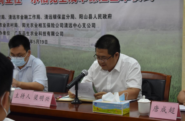 2022年5月19日下午,广东省首单清远市“政策性+商业性”水稻完全成本保险签单仪式在阳山县人民政府举行。清远市农业农村局副局长谢振权、清远市金融工作局副局长李晓瑜、阳山县人民政府副县长蓝涛、清远银保监分局保险监管科科长欧阳湘滢、阳山县农业农村局常务副局长梁明兴、副局长甘文光、阳光农险清远中支总经理陈进宏、广东品生农业科技有限公司总经理赫欢欢等出席仪式。仪式由阳山县农业农村局副局长梁明兴主持。
