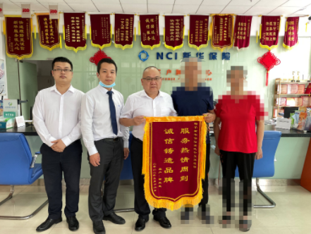 2022年5月25日,客户H先生特意来到新华保险清远中心支公司客户服务中心,向公司赠送“服务热情周到,诚信铸造品牌”的锦旗,以感谢新华保险的多年的快速理赔和暖心服务。