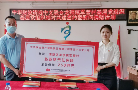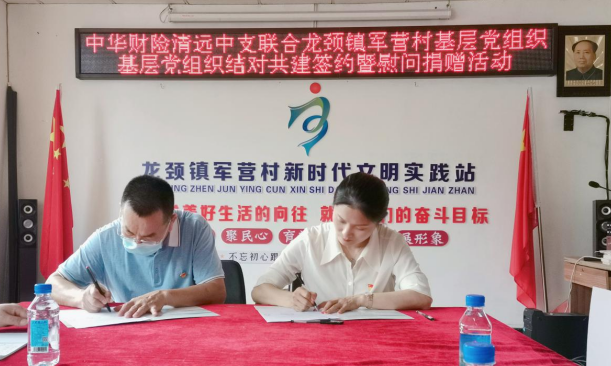 2022年6月15日上午,中华财险清远中心支公司与清新区龙颈镇军营村总支部共同举行基层党组织结对共建签约暨扶贫攻坚物资捐赠仪式。清新区龙颈镇镇委委员潘藩、军营村党总支部书记李社良,中华财险清远中心支公司党委书记杨玉雅、党委委员黄志锦出席仪式。