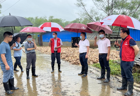 当天下午,联合工作队冒雨赶赴受灾现场察看农作物与禽畜受灾情况,指导救灾减损工作。工作队来到英德温氏禽业有限公司东华服务部,在服务部工作人员的带领下,来到养殖户鸡舍实地勘查受灾情况。据现场勘查了解,受灾户为温氏禽业合作养户,鸡舍已完全被洪水覆盖,水位高达1.8-2米,所有鸡只被水浸泡,受损鸡只约16万羽。清远市农业农村局副局长谢振权强调,需严格按照相关政策规定,做好鸡只无害化处理,尽快做好理赔报损及勘查等工作。
