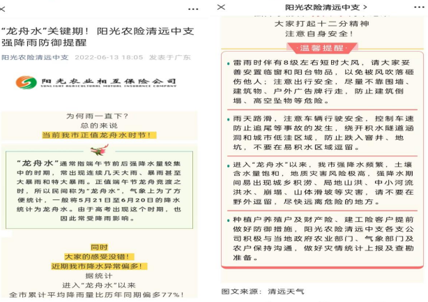暴雨到来前,阳光农险清远中支提前谋划、主动作为,做好灾害防范预警,在公司自有微信公众号刊登提醒防范暴雨信息,提醒农民和保户做好防灾减灾工作,各支公司提前主动上门对接各乡镇农业管理部门,做好防灾减灾防范工作,做好灾害统计上报和查勘定损工作。